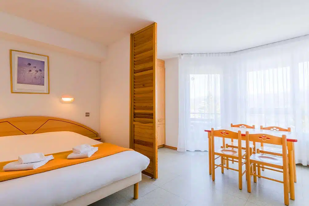 Des chalets-appart façon station de ski : chambres doubles cosy, salle de bain privées, kitchenette équipée et petite terrasse pour souffler entre deux étapes.